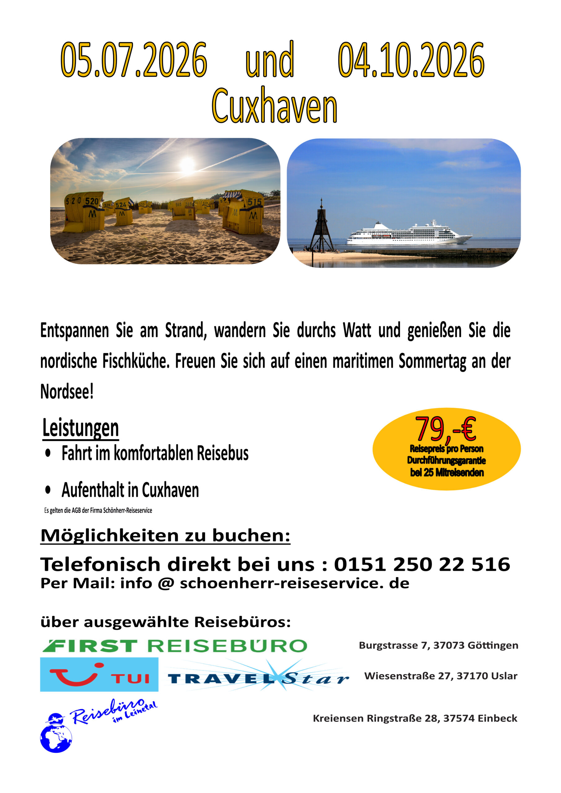 • Fahrt im komfortablen Reisebus • Aufenthalt in Cuxhaven
