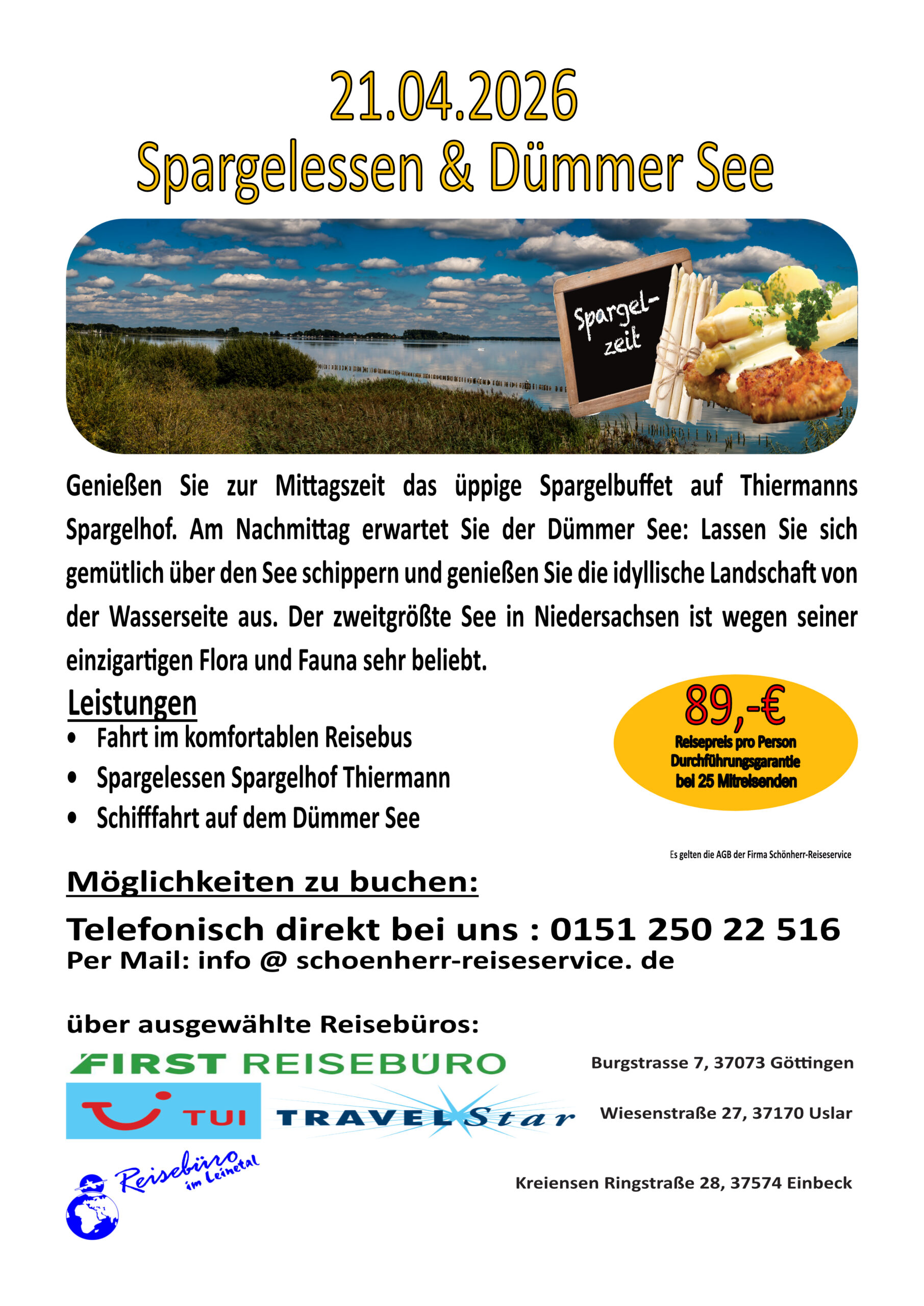 • Fahrt im komfortablen Reisebus • Spargelessen Spargelhof Thiermann • Schifffahrt auf dem Dümmer See